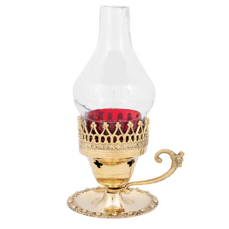 Επιτραπέζιο μπρούτζινο οικιακό καντήλι με πιατάκι και λαμπόγυαλο.
