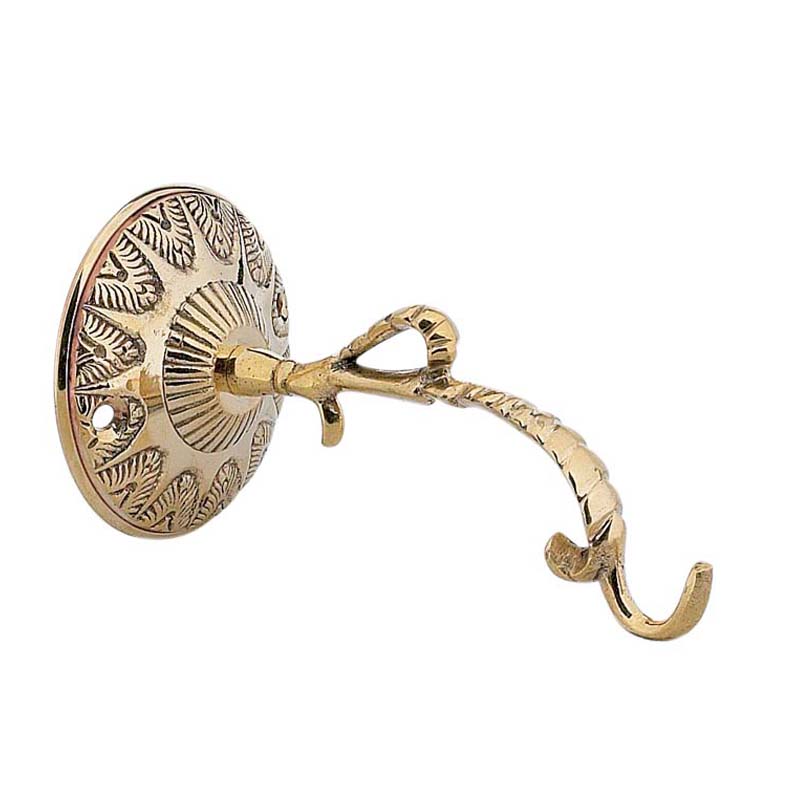 Brass wall hook for hanging vigil lamp.