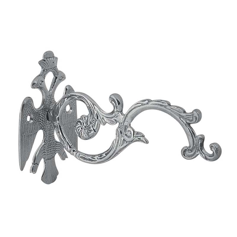 Brass wall hook with double-headed eagle for hanging vigil lamp.